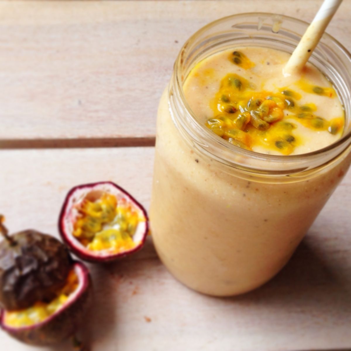 Combine all ingredients in a blender and blast until frosty smooth (save the passionfruit to garnish on top). Fill your jar, top with the passionfruit, plonk in your recycled straw and enjoy completely guilt-free.