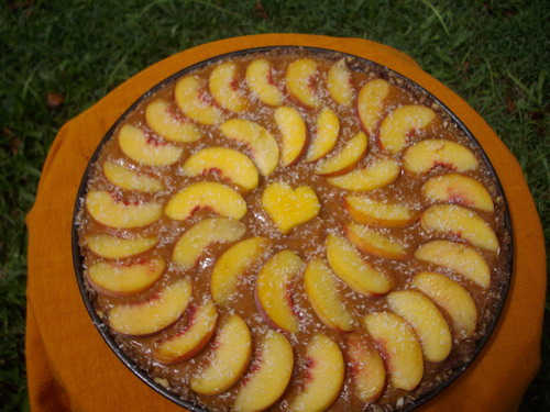 For the last couple of weeks the yellow-fleshed peaches have been sweet and delicious, melting in the mouth in a taste explosion. For my friend Jennifer’s birthday celebration last weekend I made this peach tart, so simple, made in a matter of minutes and chilled for a couple of hours before we fell upon it. I thought it was huge but it was all eaten in less time than it took to prepare.