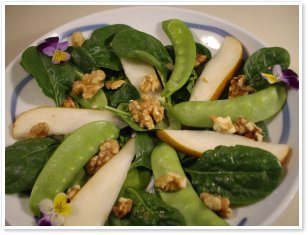 Rinse and drain spinach leaves and snowpeas and arrange in a salad bowl. Core and slice the pears, and add them. Toss the walnut halves into the bowl. Mix together the oils and lemon juice, pour over the salad and toss lightly.
