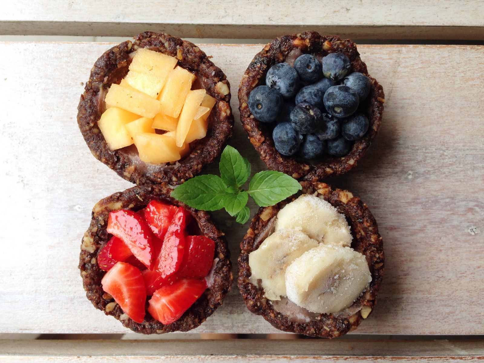 Combine the ingredients for the base in your food processor until well combined. You may need to stop and scrape the sides of the bowl down or even add a touch of water to help with combining the ingredients. Next, spoon the mixture into small cup cake moulds and place in the feeder to set for around 1-2 hours. Once set, add your favourite chopped up fruit and serve.